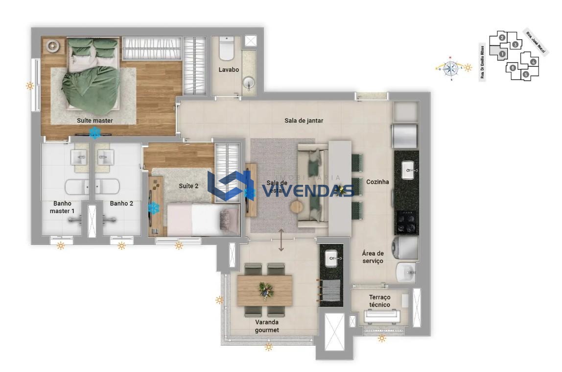 Outro destaque é a fazenda solar instalada no topo do edifício, que capta a energia do sol e a transforma em eletricidade para abastecer as áreas comuns. Com isso, o condomínio tende a ter custos mais baixos, além de contribuir para um consumo mais sustentável.
