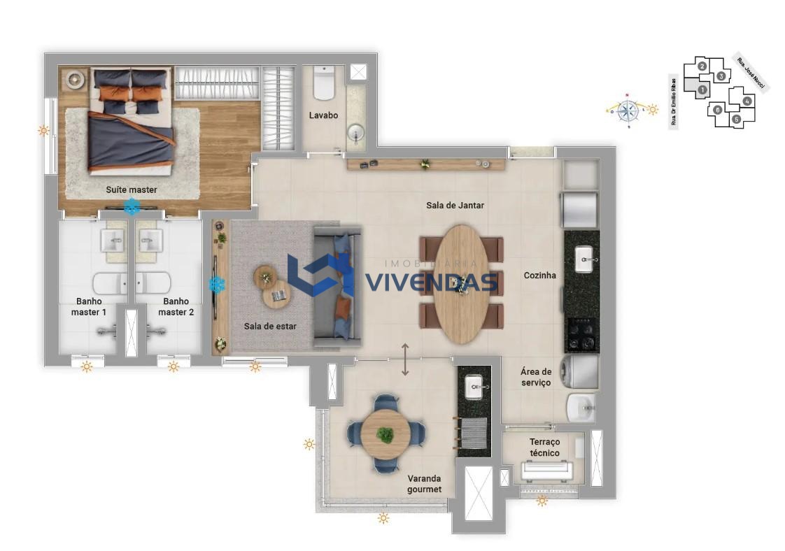 Apresentará 2 suítes, 3 banheiros sendo 1 lavabo, varanda gourmet com churrasqueira, sala de estar e jantar, 1 vaga de garagem coberta e depósito extra.