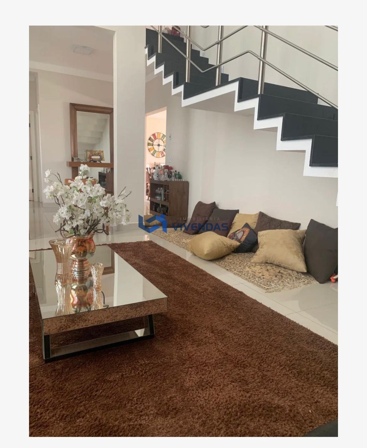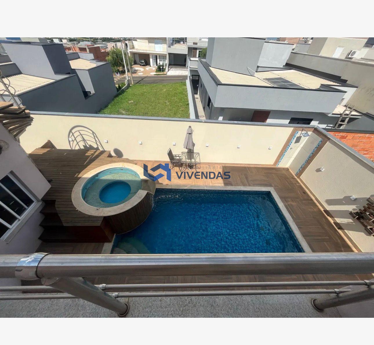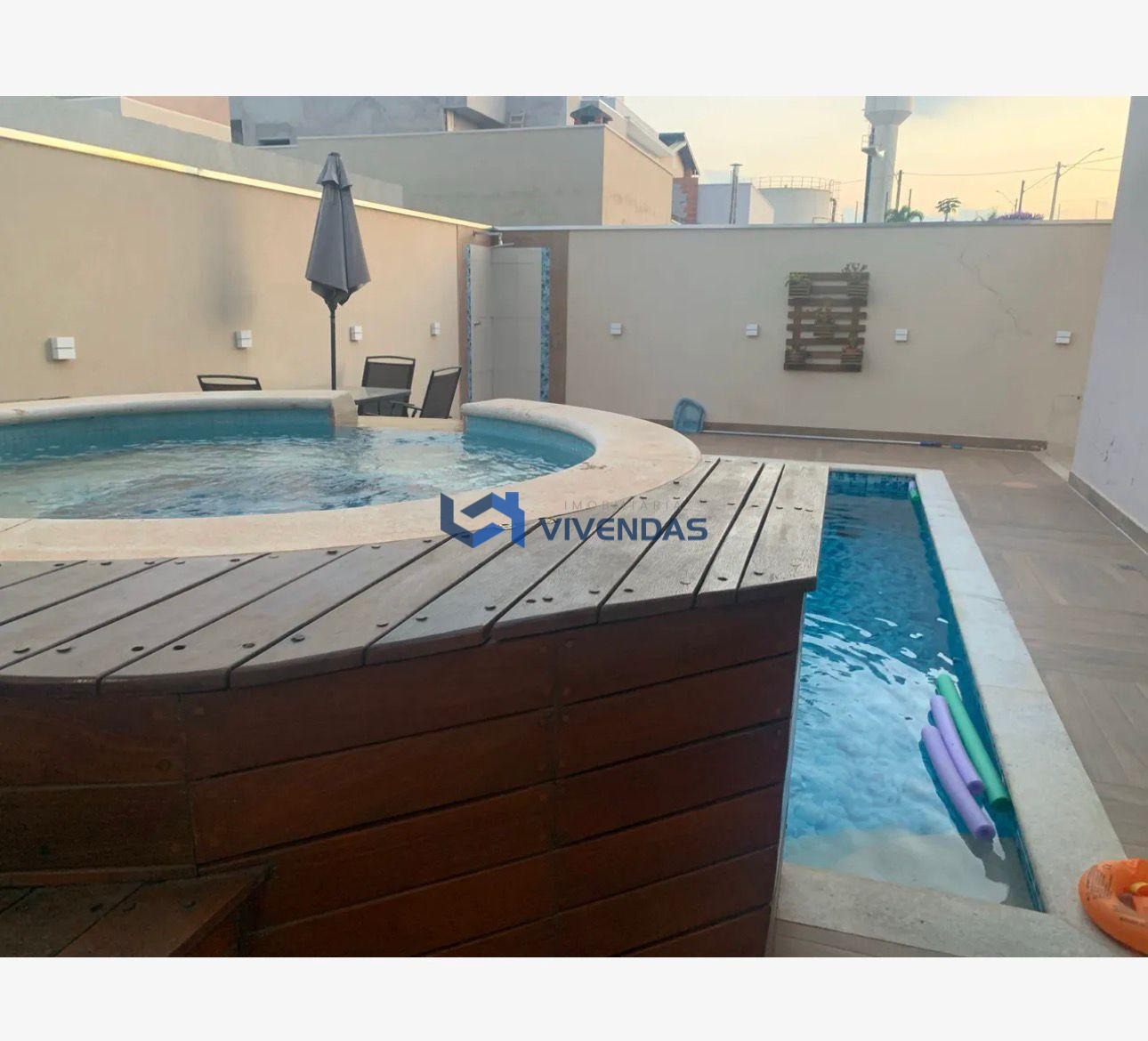 A casa apresenta sala de estar, e sala de jantar, cozinha planejada, despensa, área de serviço, 3 dormitórios sendo 3 suítes e duas com closet, escritório no piso inferior, podendo ser utilizado também como dormitório. Área gourmet com churrasqueira, jardim de inverno, piscina e ofurô.